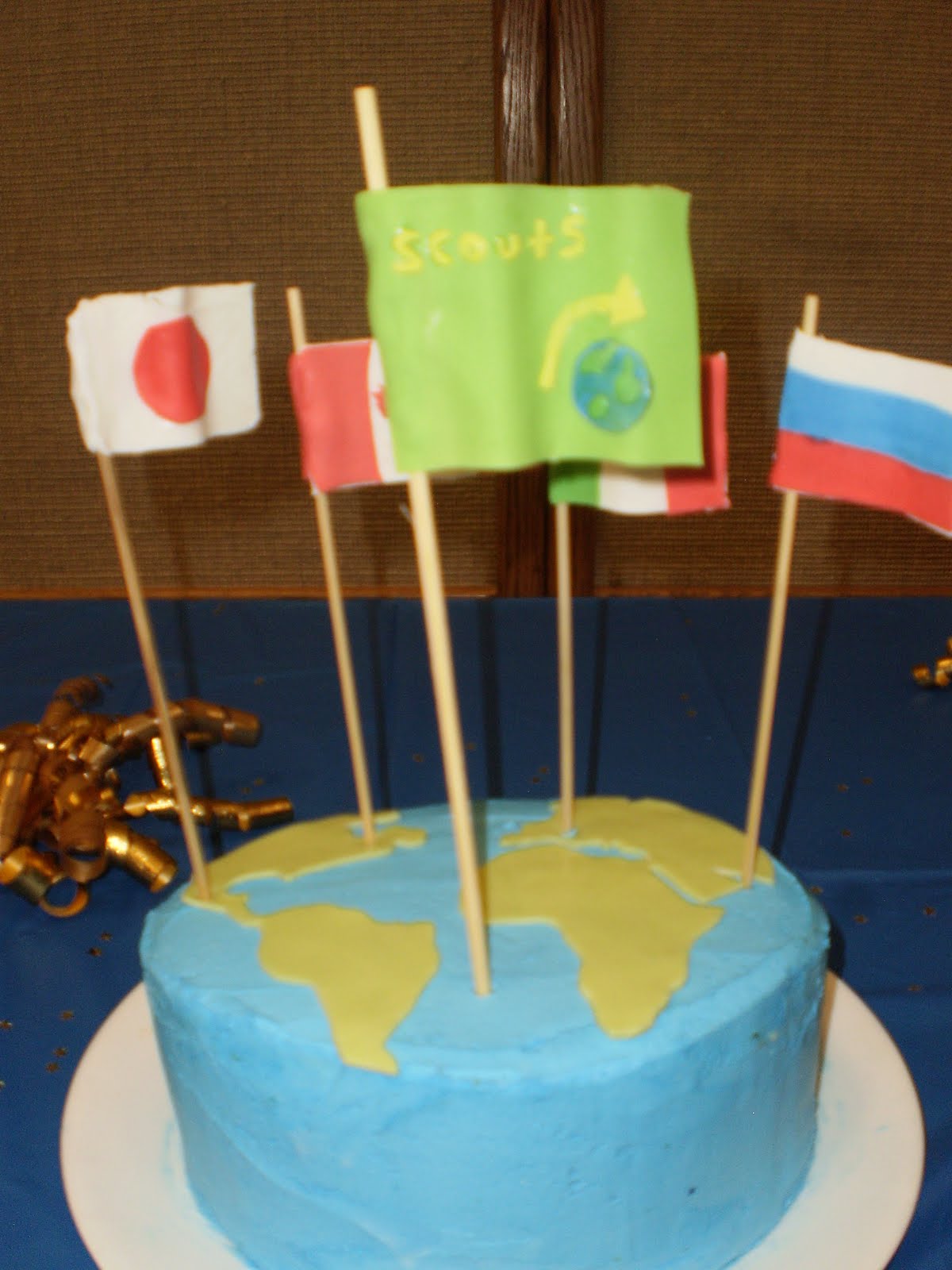 This was for my brothers scout banquet (he was supposed to make it but it was almost all me). We won the lamest award: smoothest icing. The banquets theme was scouts around the world (the flag in the front says scouts around the world although it looks like scouts recycling).